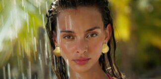 Former Miss Universe Demi-Leigh and Nicole Meyer dancing round a bonfire for WorldSwimsuit